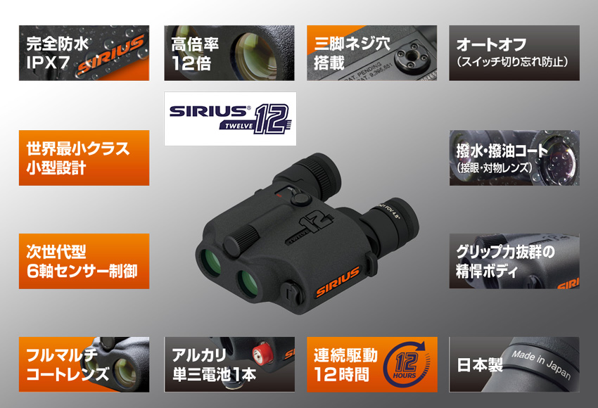 ■シリウス12〈トウェルブ〉は独自ジャイロセンサーを搭載した12倍、完全防水の日本製防振双眼鏡。