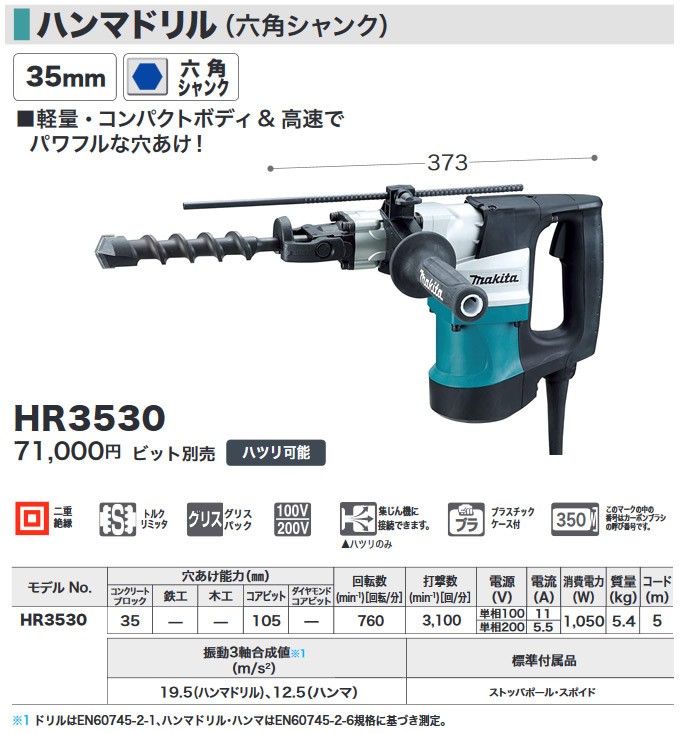 マキタ 35mm ハンマドリル (六角シャンク) HR3530 ケース付