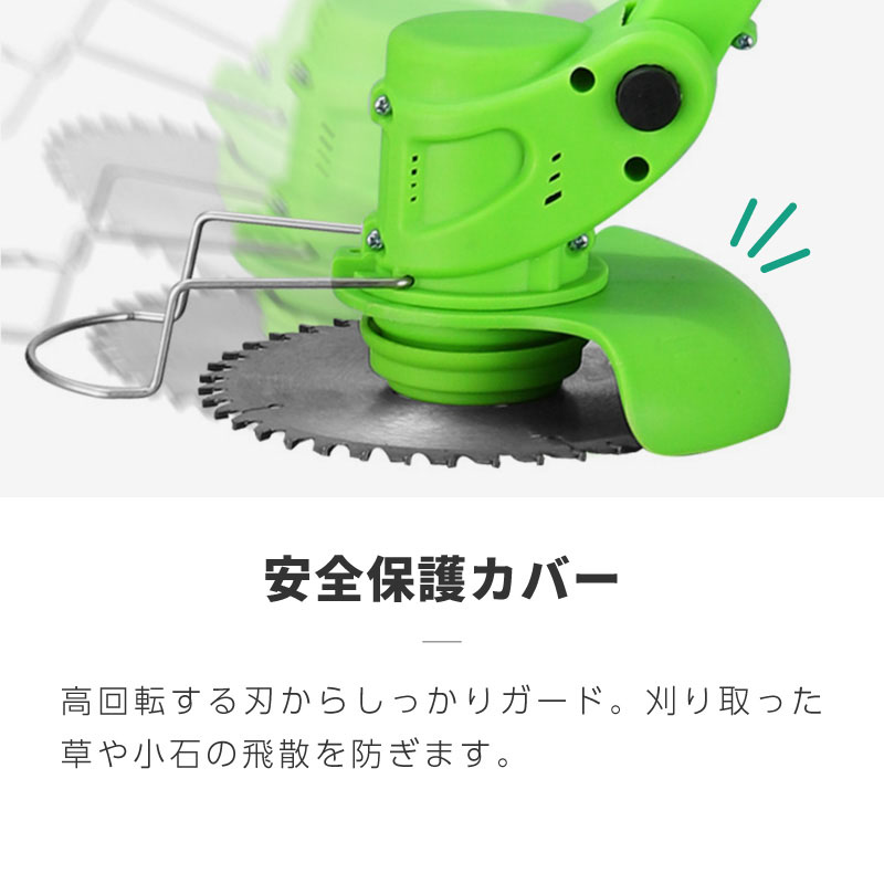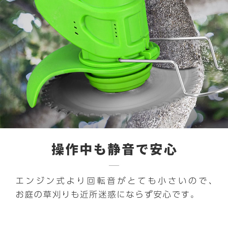 お庭の草刈りも、近所迷惑にならず安心です。全長を85cmから121cmまで持ちやすい長さに調整できます。チップソー / 2枚刃 / ナイロン刃 3種類の刃が付属。芝から硬い草まで対応します。チップソー : 茎が太い草や密集した雑草等硬い物に最適です。2枚刃 : 刃渡りが長いので背の低い雑草や柔らかい草を効率よく刈ることができます。ナイロン刃 : とても軽い芝生でも切りすぎること無くきれいにカットできます。スイッチはロックボタンを押しながらでないと引けない安全仕様です。立木やブロック塀に当たらない安全ガードと小石の飛散を防ぐ安全保護カバー付きで安全にご使用いただけます。地面の傾斜に合わせてヘッドを+30度、0度、-30度の3段階に調整できます。