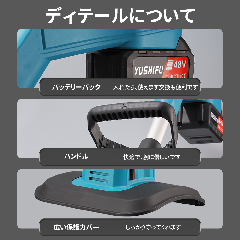 改良点:作業場所に応じて適切なモードを選べ、作業効率がアップします。改良点:耕うん刃を 4 つ付属し、耕運幅が 225mm に達します。改良点:安全ロック機能を備え、起動時に安全ロックボタンとスイッチを同時に押して、誤操作を防ぎます。改良点:補佐ハンドルを付属し、作業内容に応じて位置や角度を自由に調整でき、作業効率を高めます。