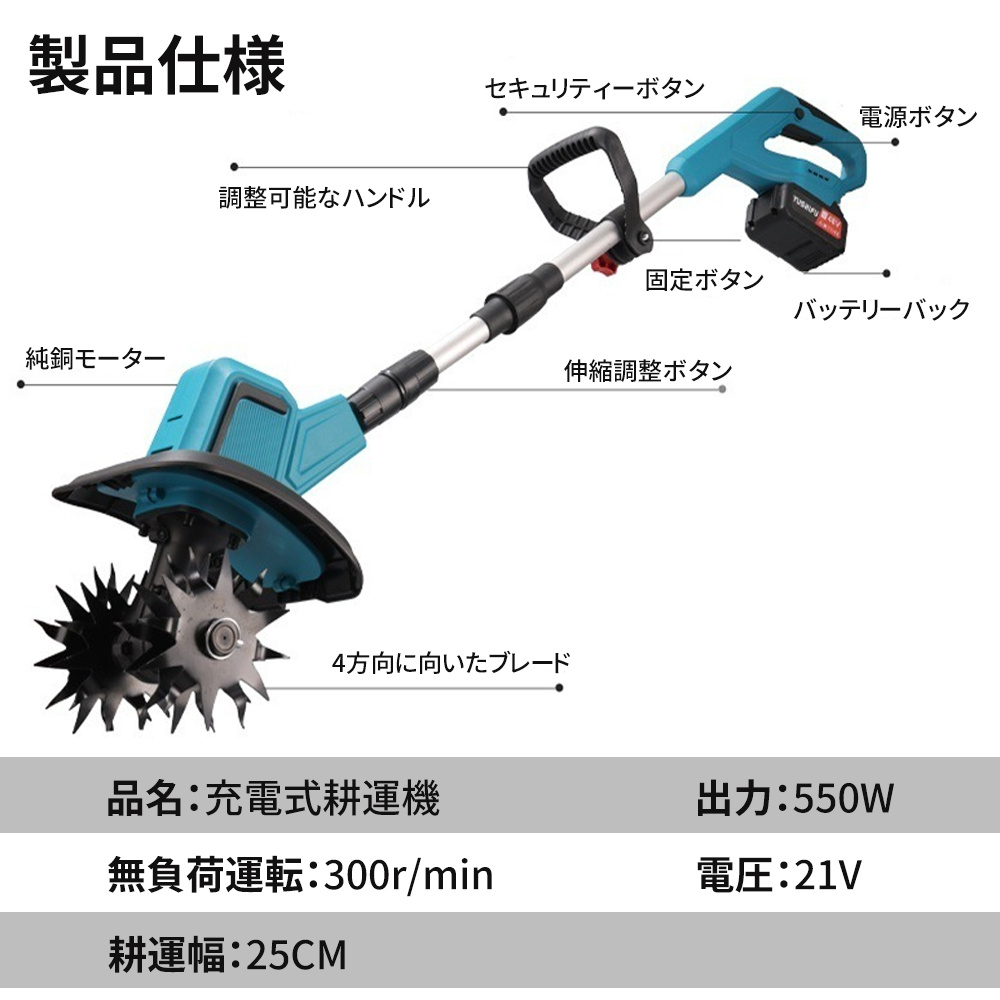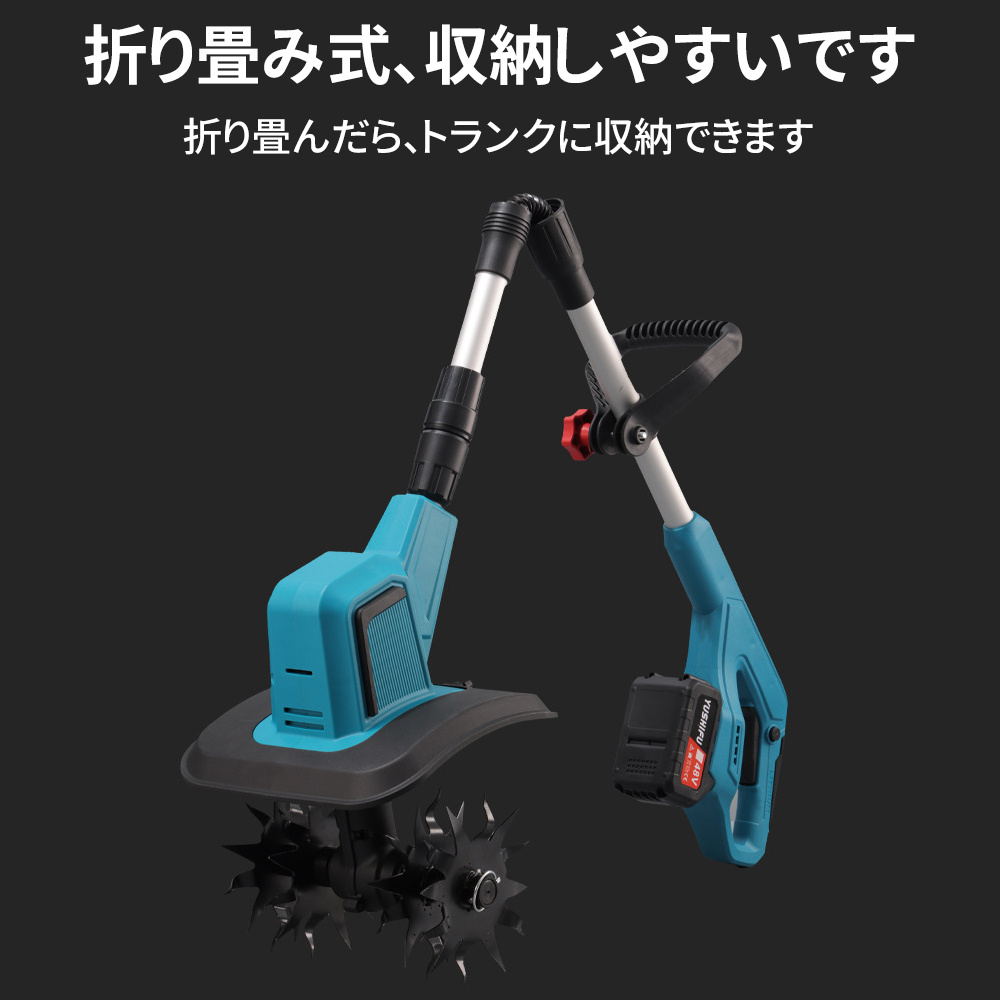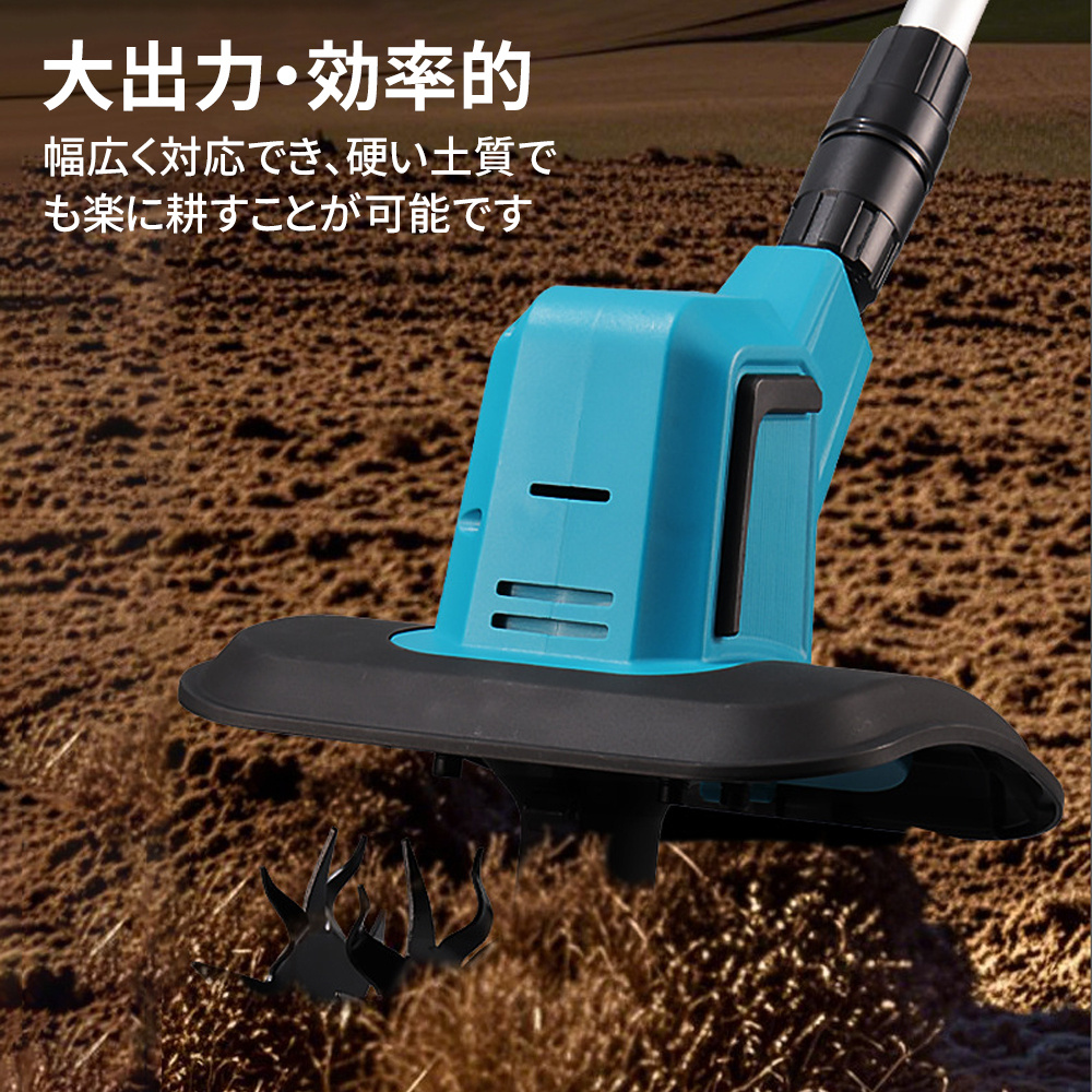 使いやすさに配慮した設計で、女性や田舎暮らしを始める定年後の方に最適。エンジン式よりも音や排気ガスが出ないので、住宅地の庭でも安心して使える。燃料やオイル交換不要でメンテ簡単。家庭菜園、農園、ビニールハウス、ガーデンなどで土を掘る作業に役立つ。電源がない場所や延長ケーブルが足りない現場でも便利。充電式なので、どこでも持ち運べます!