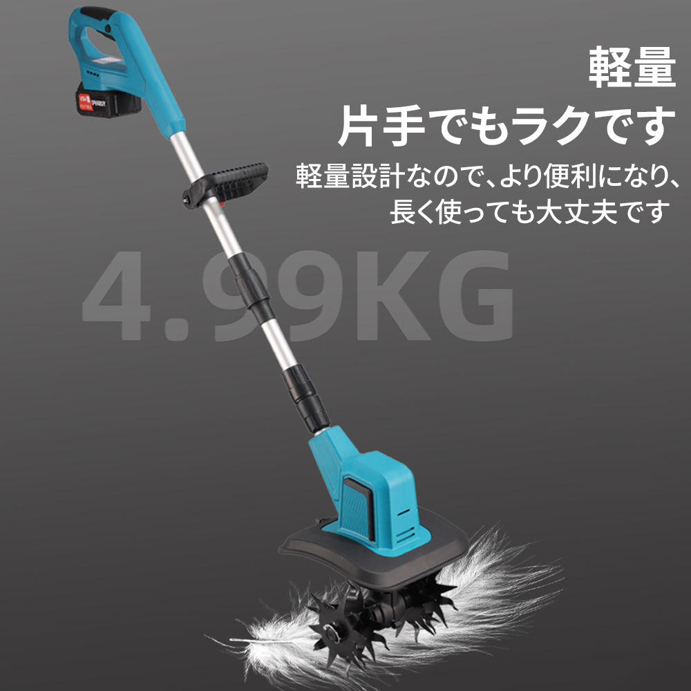 実用的な耕うん設計:4 枚刃の耕うんブレードを装備し、土を耕す効果に優れます。18V バッテリーの相互使用に対応しているため、専用バッテリーを追加で購入する必要がなく、使用コストを抑えられます。