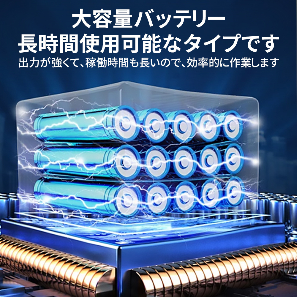 3.0Ah 大容量のリチウムイオンバッテリー付きで、十分な作業が可能です。コードレスで充電使用できるので、使用場所を選ばず、作業中に線を切る心配もありません。また、バッテリー残量や充電状態を LED で明確に表示します。