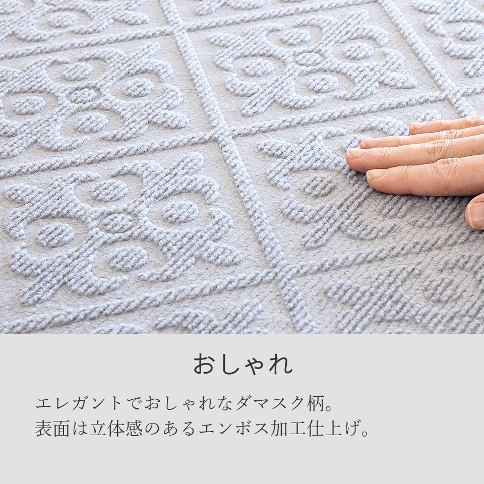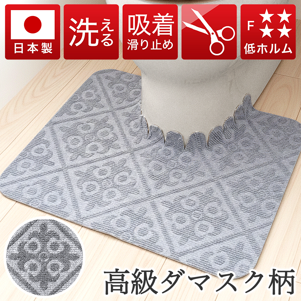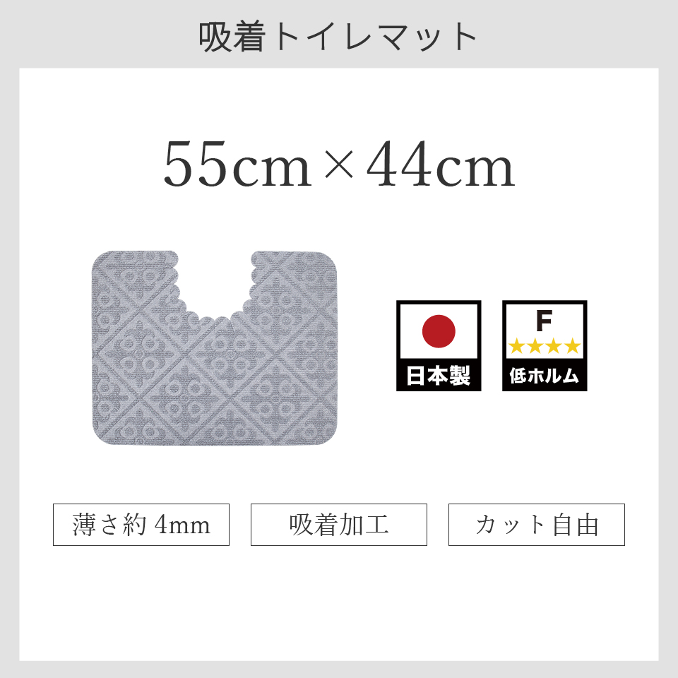 キーワード:日本製トイレマット 幅55cm×奥行44cm 洗える 吸着マット トイレ用マット 汚れ防止 防汚 エンボスダマスク柄 バリアフリートイレ対応 薄型 フリーカット おしゃれ 柄付き ずれない ウォッシャブル オールシーズン 床 フローリング 底冷え 寒さ対策 足元寒さ対策 安心の低ホルム フォースター bakugai202602