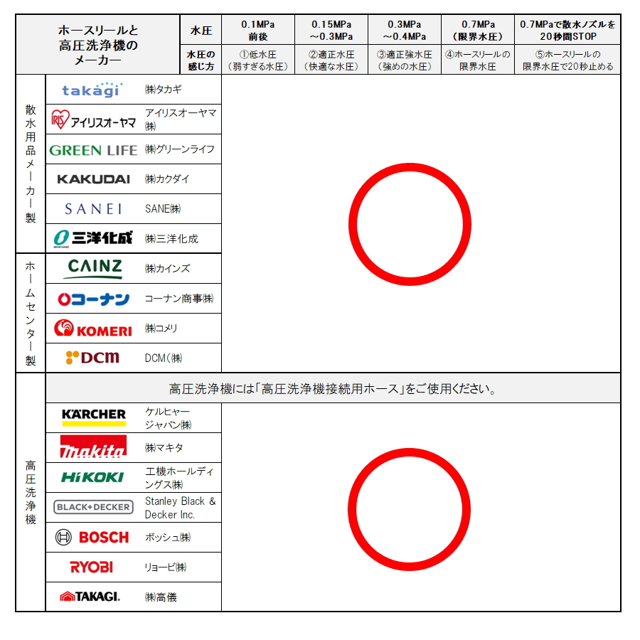 下記の表のとおり、主要メーカーのホースリールは取り付け可能で「ホースの抜けや水漏れ」はありませんでした。 可能な限り得られた検証の結果で、当社販売の庭用蛇口は高い機能性と品質を保証し、販売後のアフターフォローも含め、安心して使用できます。
