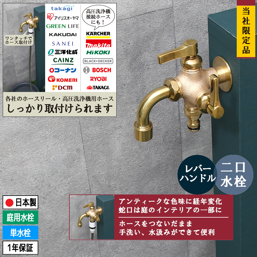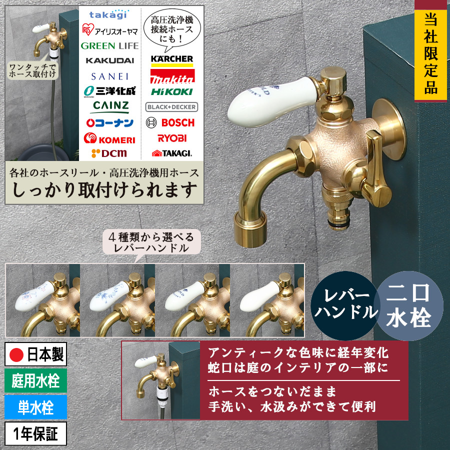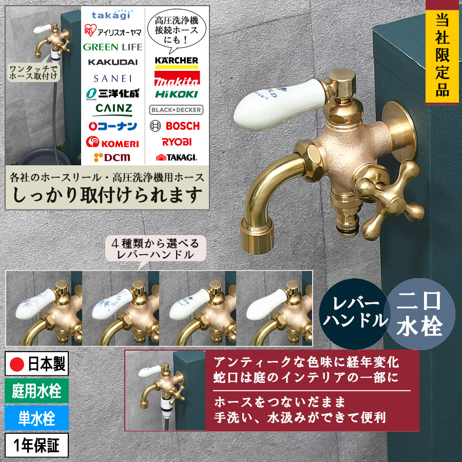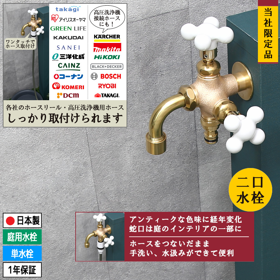 屋外でホースリールに接続し「お花・庭木の水やり、洗車、庭掃除など」を目的としたガーデニング用の蛇口です。