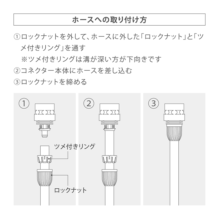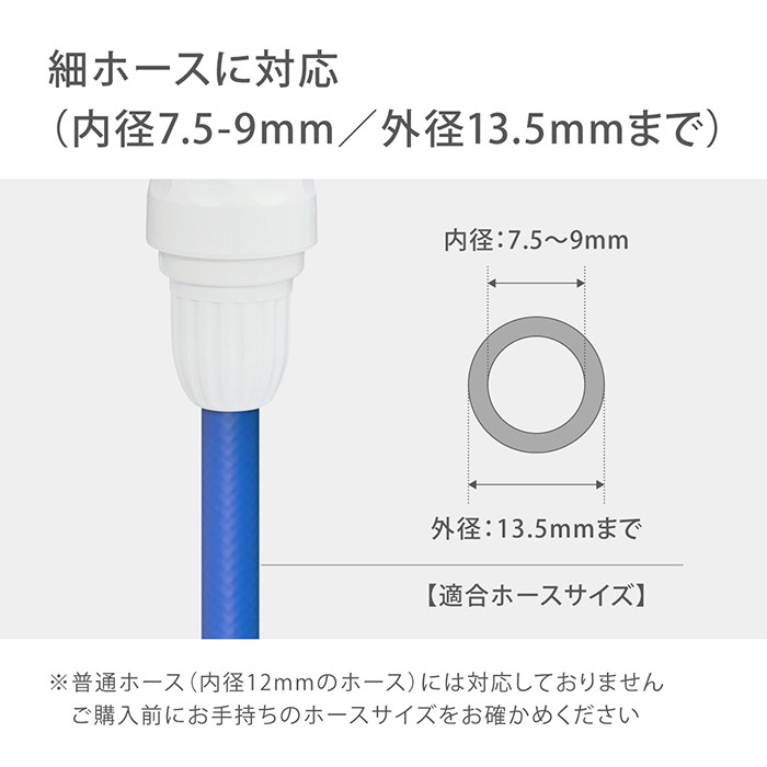 細ホース(内径7.5-9mm/外径13.5mm)に対応しています。