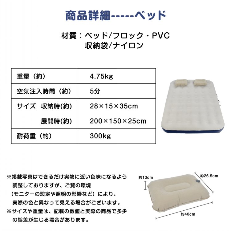 ・材質:ベッド/フロック、PVC・収納袋/ナイロン・ポンプ/ABS