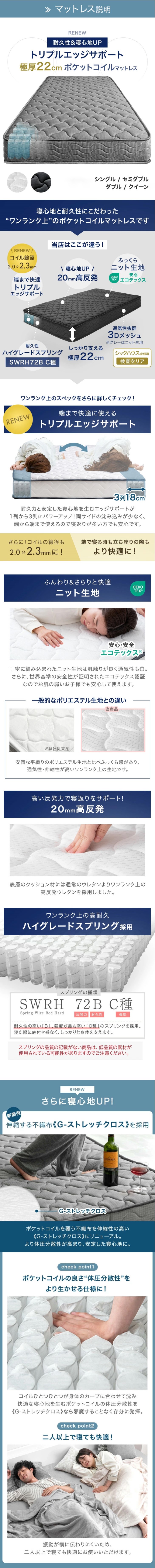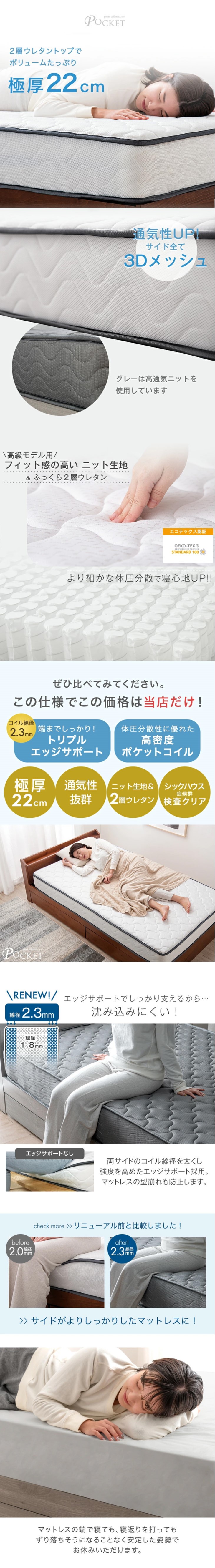 ベッド マットレス付き シングル 極厚22cm ポケットコイル