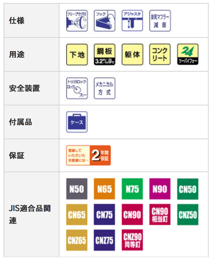N50~N90、CN50~CN90、鋼板用45~75、コンクリート用45~65対応