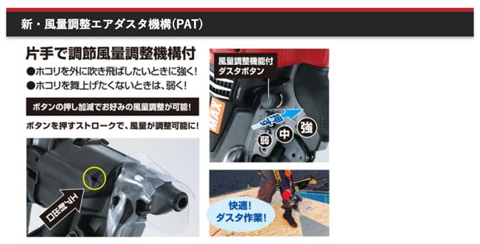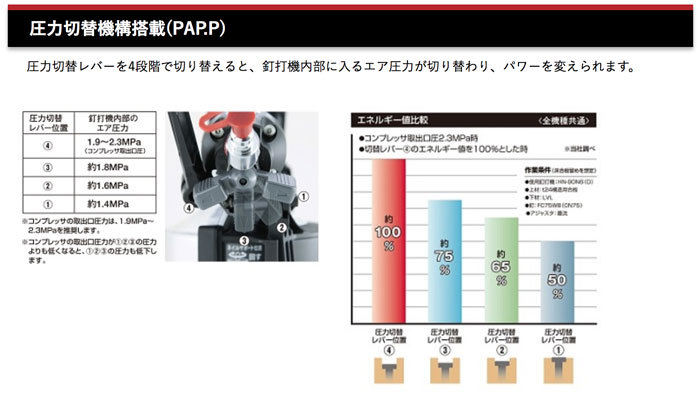 圧力切替レバーが手元について簡単に釘打機内部に入るエア圧力を変えることができます。