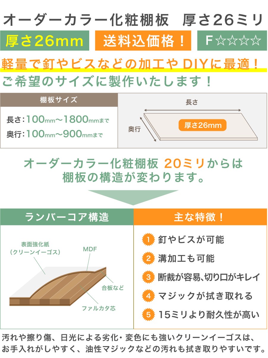オーダー カラー化粧 棚板 厚さ26mm 長さ〜1200mm 奥行〜900mm 1mm単位のオーダー可能 長さ1面はテープ処理済み