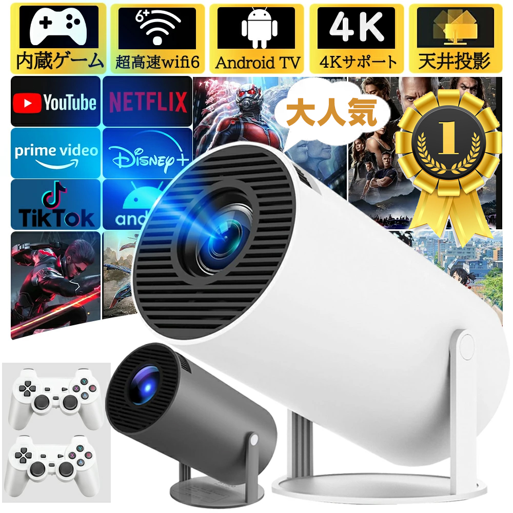 プロジェクター 家庭用 軽量 本体 天井投影 小型 270度回転 Android TV11 wi-fi6 自動台形補正 短距離 スピーカー内蔵 HDMI リモコン 一人暮らし ホームシアター