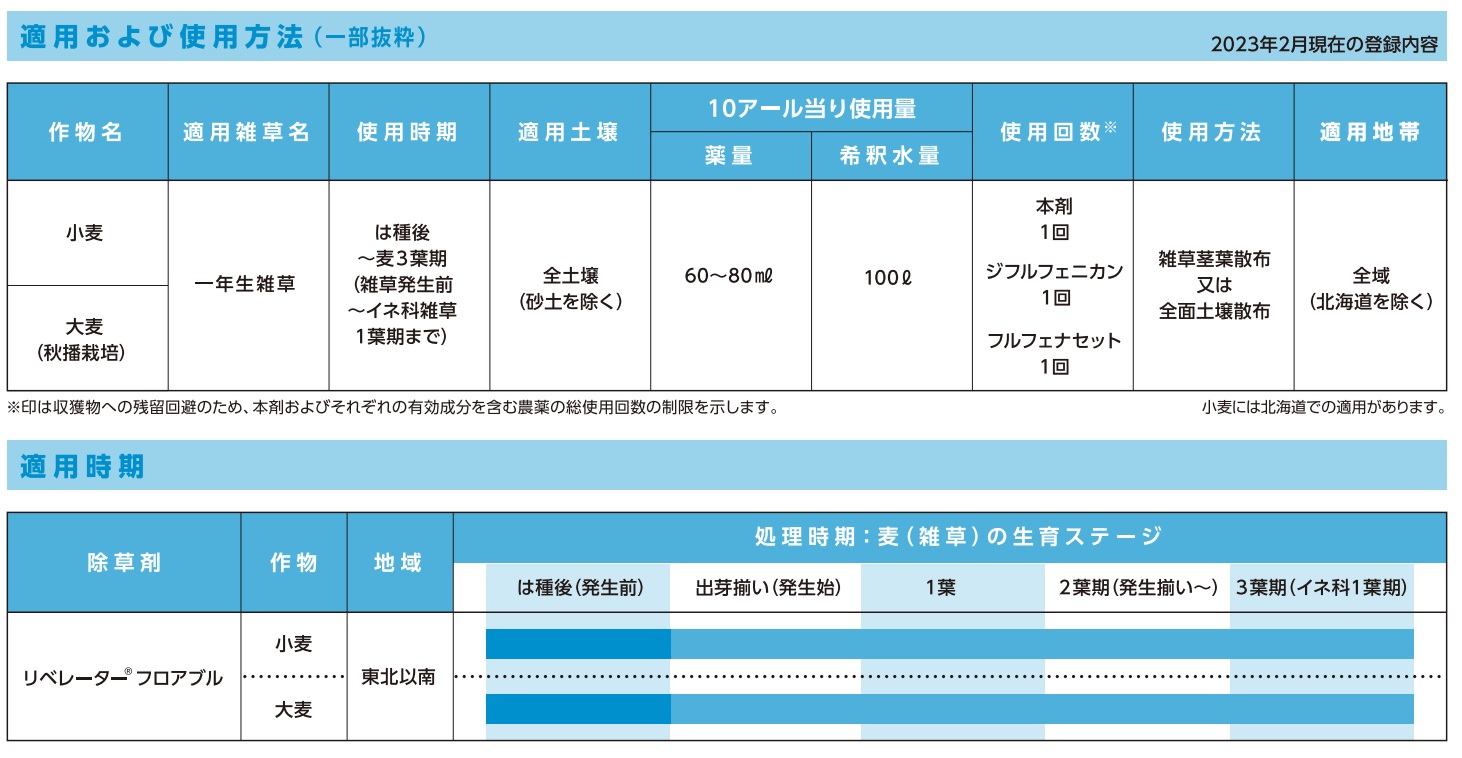 ・幅広い散布適期を有し、麦は種後から麦3葉期まで使用できます。(イネ科雑草1葉期まで)