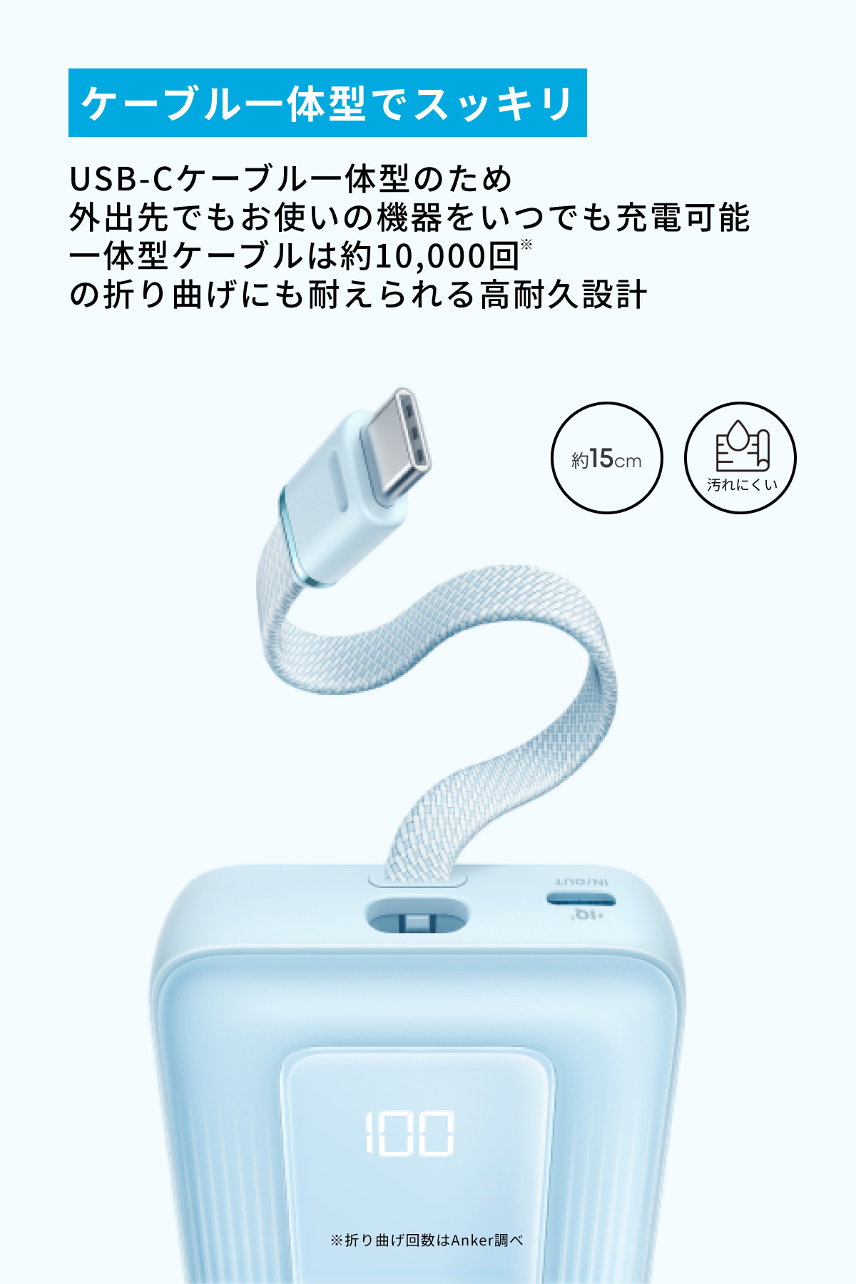 USB-Cケーブル一体型のため、外出先でもお使いの機器をいつでも充電可能です。約15cmの一体型ケーブルは約10,000回 の折り曲げにも耐えられる高耐久設計。(折り曲げ回数はAnker調べ)