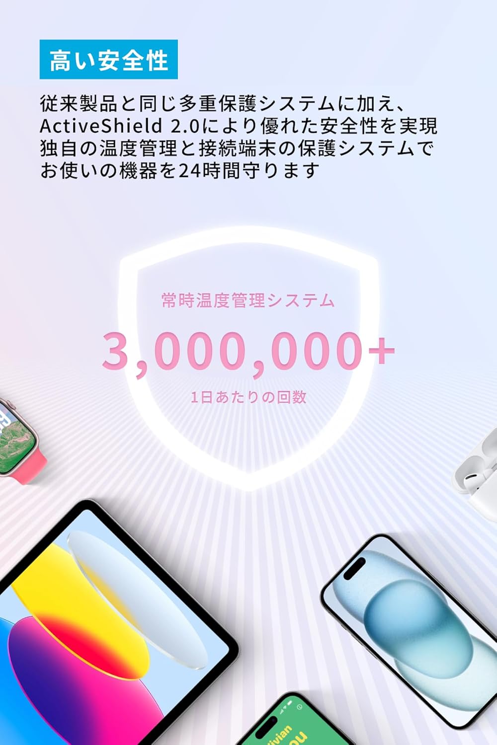 従来製品と同じ多重保護システムに加え、ActiveShield 2.0により優れた安全性を実現。独自の温度管理と接続端末の保護システムで、お使いの機器を24時間守ります。