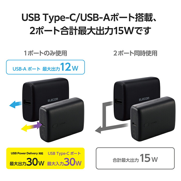 ■出力:USB Type-C:5V/3A, 9V/3A, 12V/2.5A, 15V/2A, 20V/1.5A(最大30W)、USB-A:5V/2.4A、2ポート同時接続時:5V/3A (合計最大出力15W)