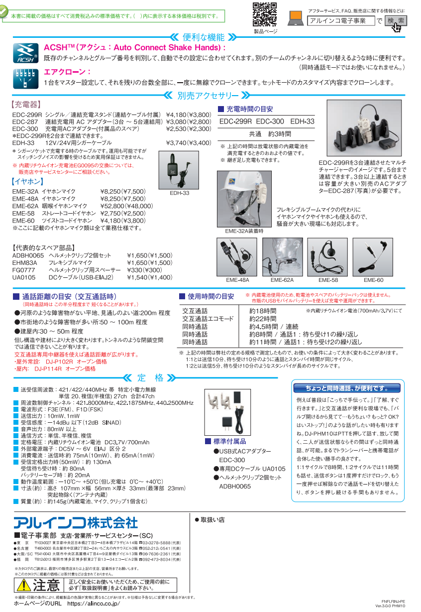 この製品に対応するヘルメットのふち(つば)の幅は15mm以内です。また、それ以内でも曲がっているなど特殊なつばには装着できないことがあります。また、スポーツ、バイクなど作業用ヘルメット以外のものは安全面や風切音の問題があり、お使いになれません。DJ-R20DやR100Dなどに搭載の「最初に着信音を鳴らしてから通話」する同時通話時の呼び出しモードは搭載していません。別の同時通話機種を混用するときは強制モードでお使いください。他社製の同時通話機種とは混用できません。