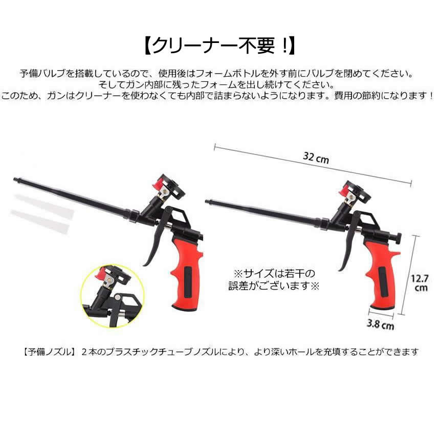 【クリーナー不要】予備バルブを搭載しているので、使用後はフォームボトルを外す前にバルブを閉めてください。そしてガン内部に残ったフォームを出し続けてください。このため、ガンはクリーナーを使わなくても内部で詰まらないようになります。費用の節約になります!【予備ノズル】2本のプラスチックチューブノズルにより、より深いホールを充填することができます【使いやすい】スプリングトリガーとコントロールノブにより正確な流量とスプレー距離を調整でき、フォームの無駄を減らします【高品質な素材】テフロン錆止め加工された高品質のアルミで作られ、より頑丈です【幅広く使える】高い伸び率と低い収縮率、強度の高い接着ができますので、充填・封止・小さなすき間埋めに最適です★★