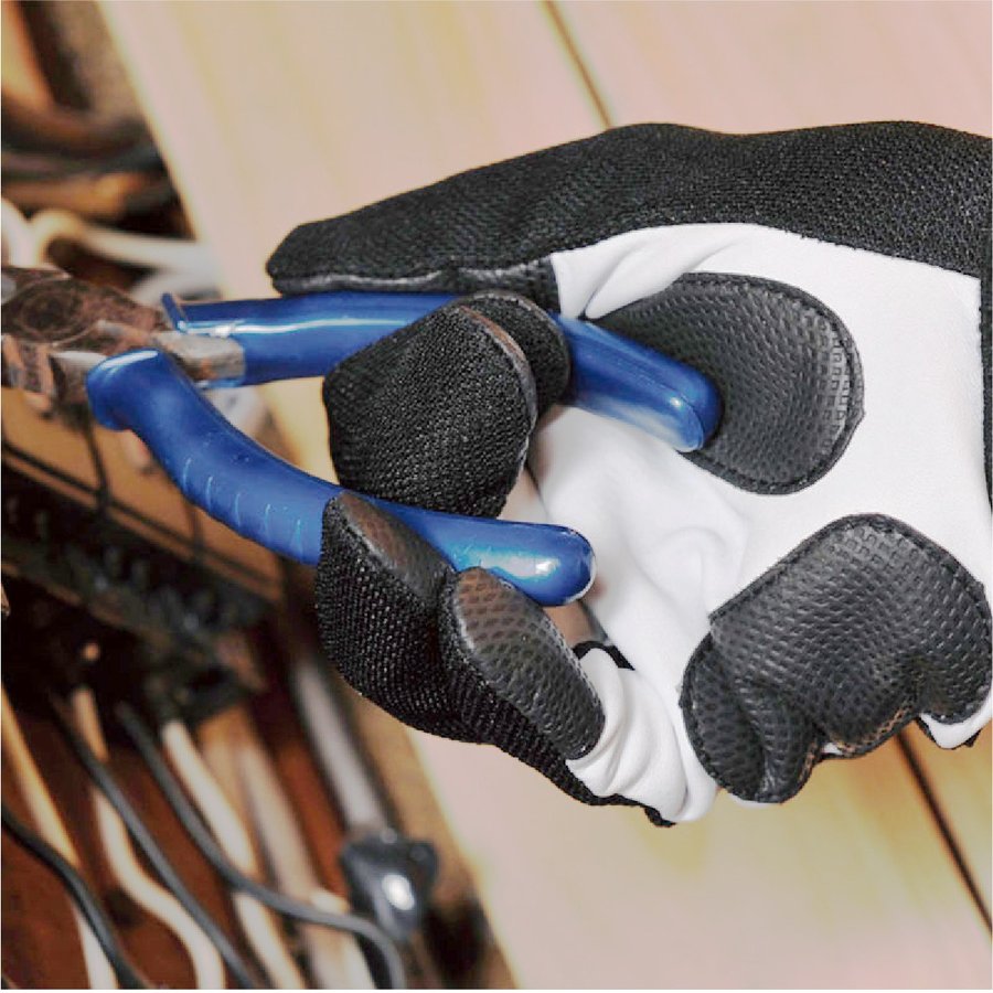 ■特長:手の平には牛本革を使用。しなやかさがあり、使い込むほど手に馴染みます。摩擦や水に強い滑り止め(人工皮革)加工で、指先をしっかりガードします。甲側に吸汗・速乾生地を使用しているので、ムレにくく、汗拭きにも最適です。