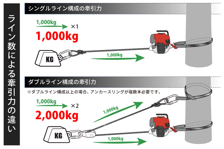 PCW4000は1本のロープで直接引いた場合、牽引力が1000kgあります。もっと牽引力を上げたい場合、上図のようにフックとアンカースリングを追加すると牽引力を2倍にする事ができます。ライン数が増えるほどに牽引速度は落ちますが、牽引力アップでより重いものを牽引できるようになりますので、フックやスリングなど用意しておくと安心して作業できるので安心です。