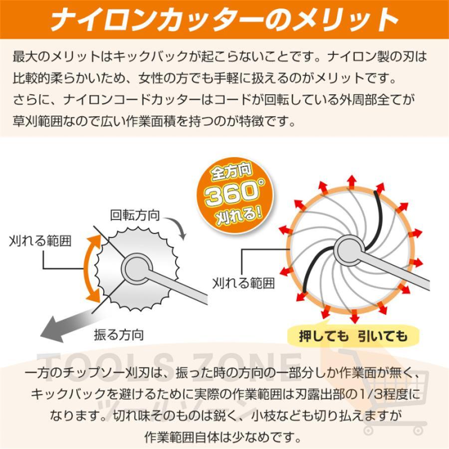 3種類の草刈り機 替え刃:草刈機電動キットは3種の替え刃(ナイロンブレード、金属ブレードとのこぎり刃)付なので、使用環境に応じて刃先を交換することができます。ナイロンブレードは、薄く柔らかい雑草を刈る時に、金属ブレードとのこぎり刃は太い枝や細い枝を切る時に使えます。いろいろな状況で、とても役に立ちます。補助ハンドルは上下に調節ができ、斜面でもらくらく垂直方向に走行させつつ除草ができます。