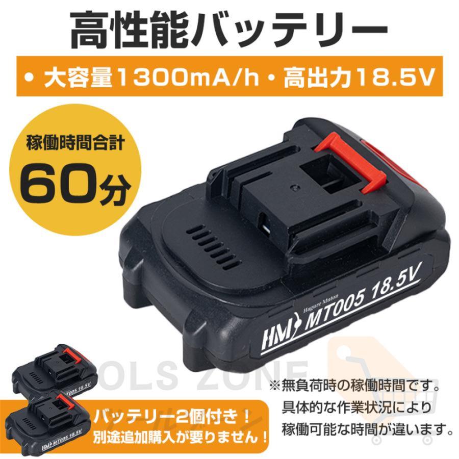 本体、バッテリー×2、電源アダプター、チップソー×2、スチールブレード×2、ナイロンブレード×5、レンチ×2、保護めがね、手袋